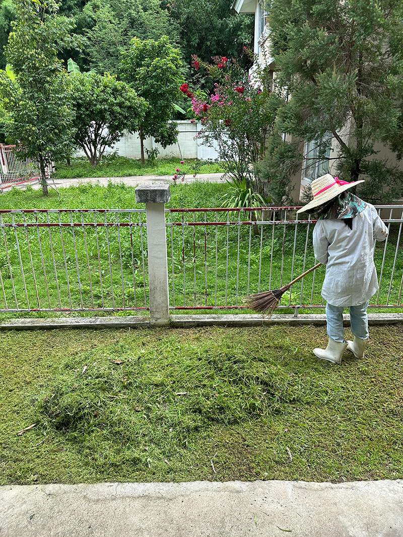 หลังจากตัดเสร็จแล้ว ต้องกวาดทำความสะอาดเศษหญ้ารอบบ้าน ด้วยไม้กวาดทางมะพร้าว