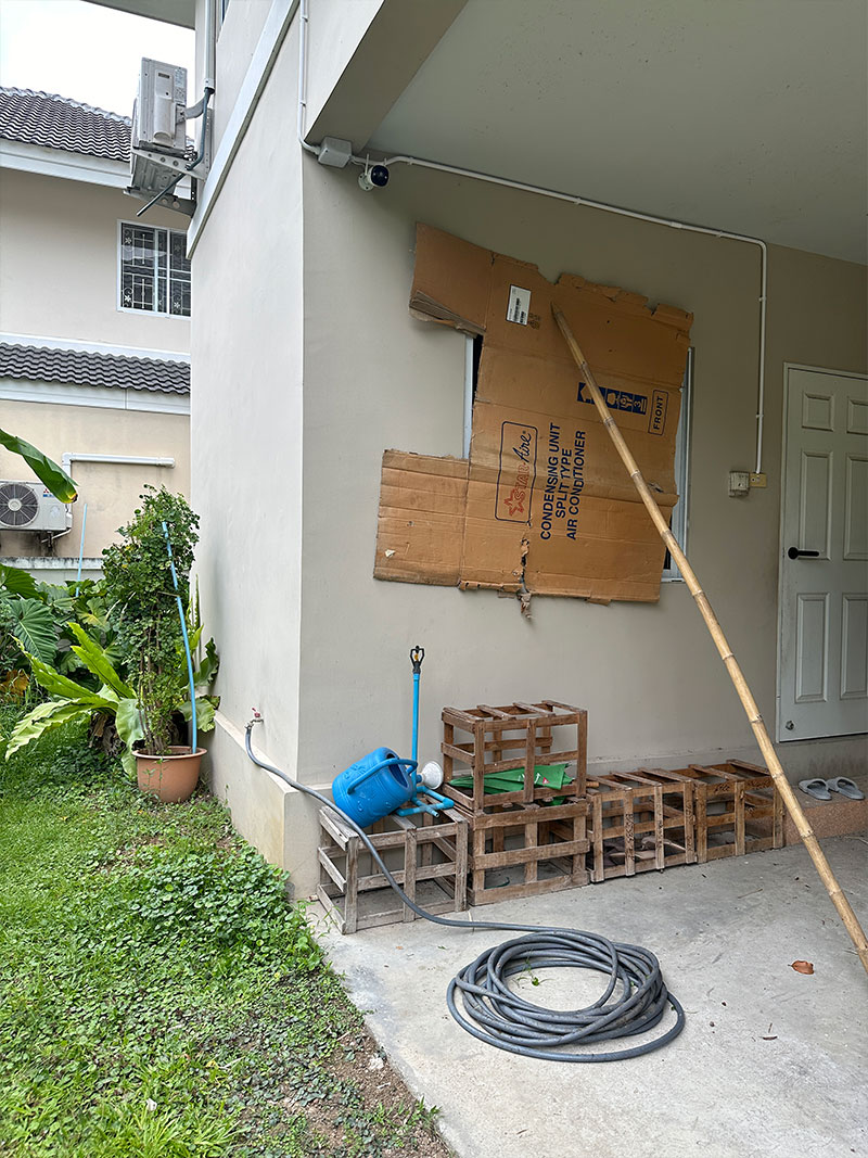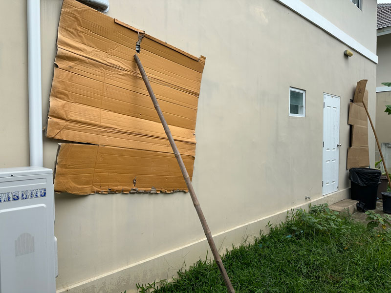 ใช้ลังกระดาษ ปิดรอบบ้าน ป้องกันหน้าต่าง ส่วนที่เป็นกระจก เพื่อไม่ให้เศษหินกระเด็นใส่
