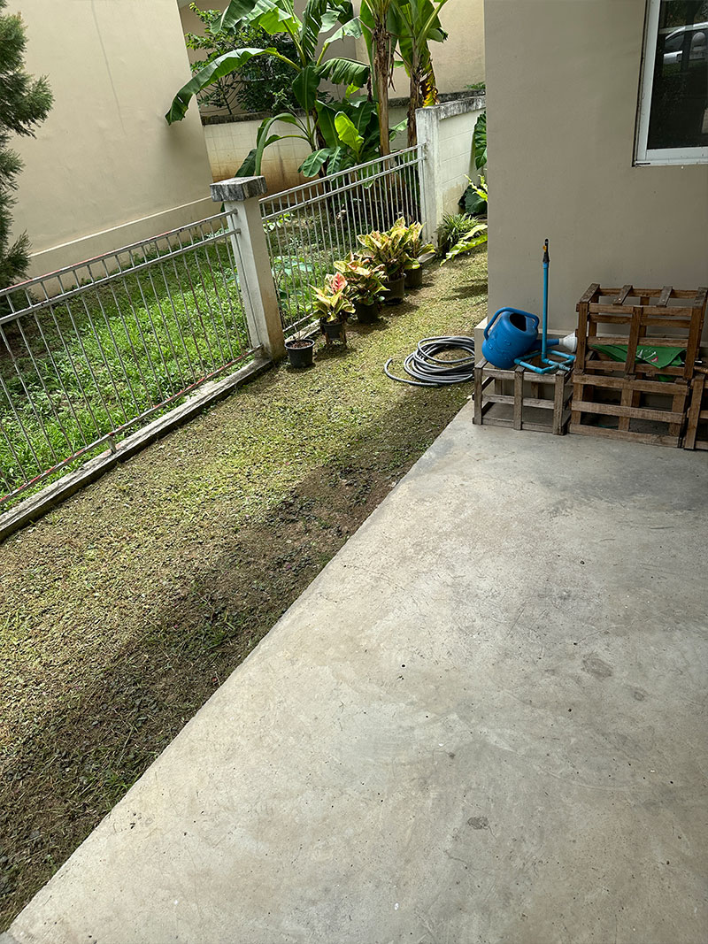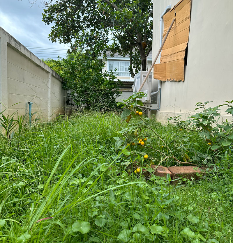 ก่อนตัดหญ้ารอบบ้าน มีหญ้าขึ้นสูง เพราะเป็นช่วงฤดูฝน ลุงจะทำการถอนบางส่วน แล้วจึงตัดด้วยเครื่อง